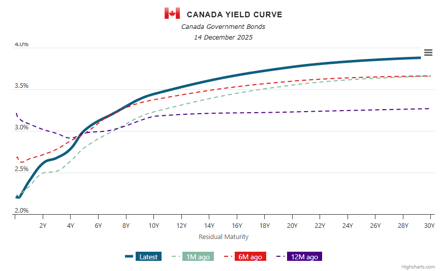 The yield curve remains steep with short maturities sharply lower in the past year (CORRA -104bp, GOC 2-year -41bp). The GIC 5 yr is +3bp yoy.