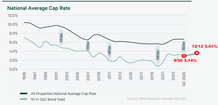 Insiders at 26 of 36 REIT/REOCs were buyers since 12/31/24 (to 12/12) and 4 had net insider sales. After very light activity from May-September, buying picked up recently with notable purchases at Killam and Artis. REIT/REOCs have repurchased $862mm of equity ytd (reported to 12/12) with the largest buybacks at Artis (5.0% of market cap), CAPREIT (5.0%), Minto (4.8%), and Primaris (4.5%). CAPREIT resumed purchases in November and bought $89mm. Some REITs that were aggressive buyers in 1H25 reported no buybacks in September-November (Riocan, Granite, and Minto).