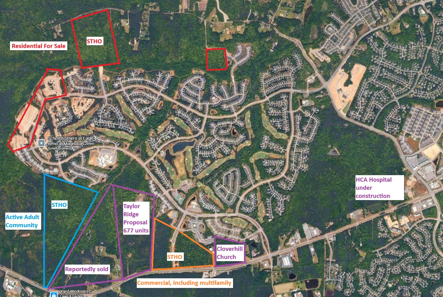Commercial - STHO received zoning approval in 2025 to remove restrictions on the building sizes and to allow a portion to used for residential development. A 14 acre parcel is reportedly now under contract for a 240 unit luxury apartment project. Prospects for the Retail and Office portions of STHO’s commercial sites should be improving as all the green spaces above are filled in.